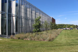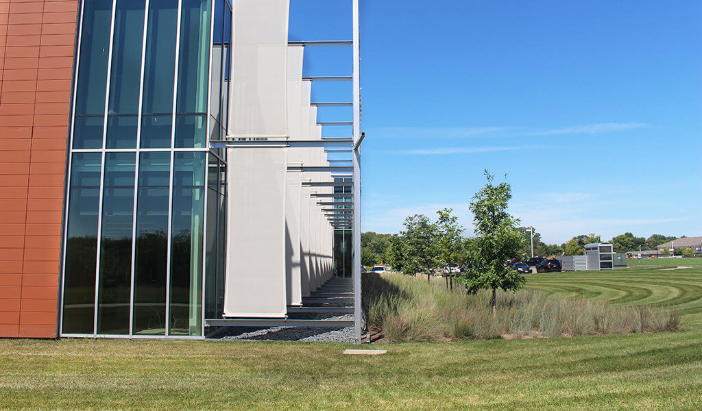 In addition to the open floor plan, the space was also designed to allow plentiful access to daylight. To limit excess heat and glare on the south side of the building, a louvered sunscreen covers the aluminum-clad curtain wall. Rising from floor to ceiling, the sunscreen lets in plenty of natural light while maintaining a comfortable environment inside. And because of the additional story over the original building, the company name and logo gained more visibility to the interstate.