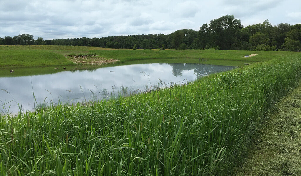 Specific elements were incorporated into the pond’s design to promote water quality and meet project goals, including a sediment forebay, shallow slopes, an impermeable clay base layer, and seepage mitigation measures such as drainage diaphragms. These features, along with native plantings and a recently added prairie buffer, help filter pollutants off the adjacent highway and farm fields and protect the pond as water enters. With a healthy pond system established, our environmental team equipped the pond with various items to enhance fish habitat, including spawning beds, jetties, and assorted depth pools.
