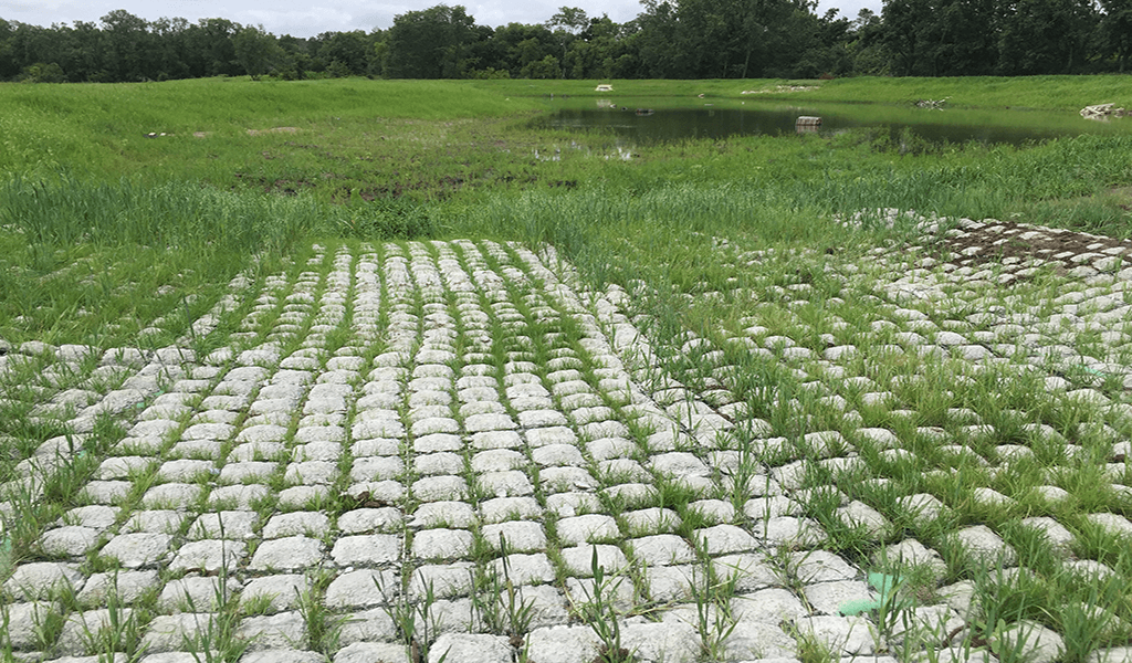 Since Wanatee Creek experiences high velocity flows, additional Flexamat® was installed across the bottom of the channel to further protect against scour associated with the new bridge. The result was an extremely smooth streambank transition that is hard armored, easy to maintain, and much more aesthetically pleasing than the bits of broken concrete that previously lined the banks. After a summer’s worth of vegetation growth through the Flexamat®, the project has shown a major improvement in water quality, stream function, stabilization, and in-stream wildlife habitat, all while successfully complementing the park.